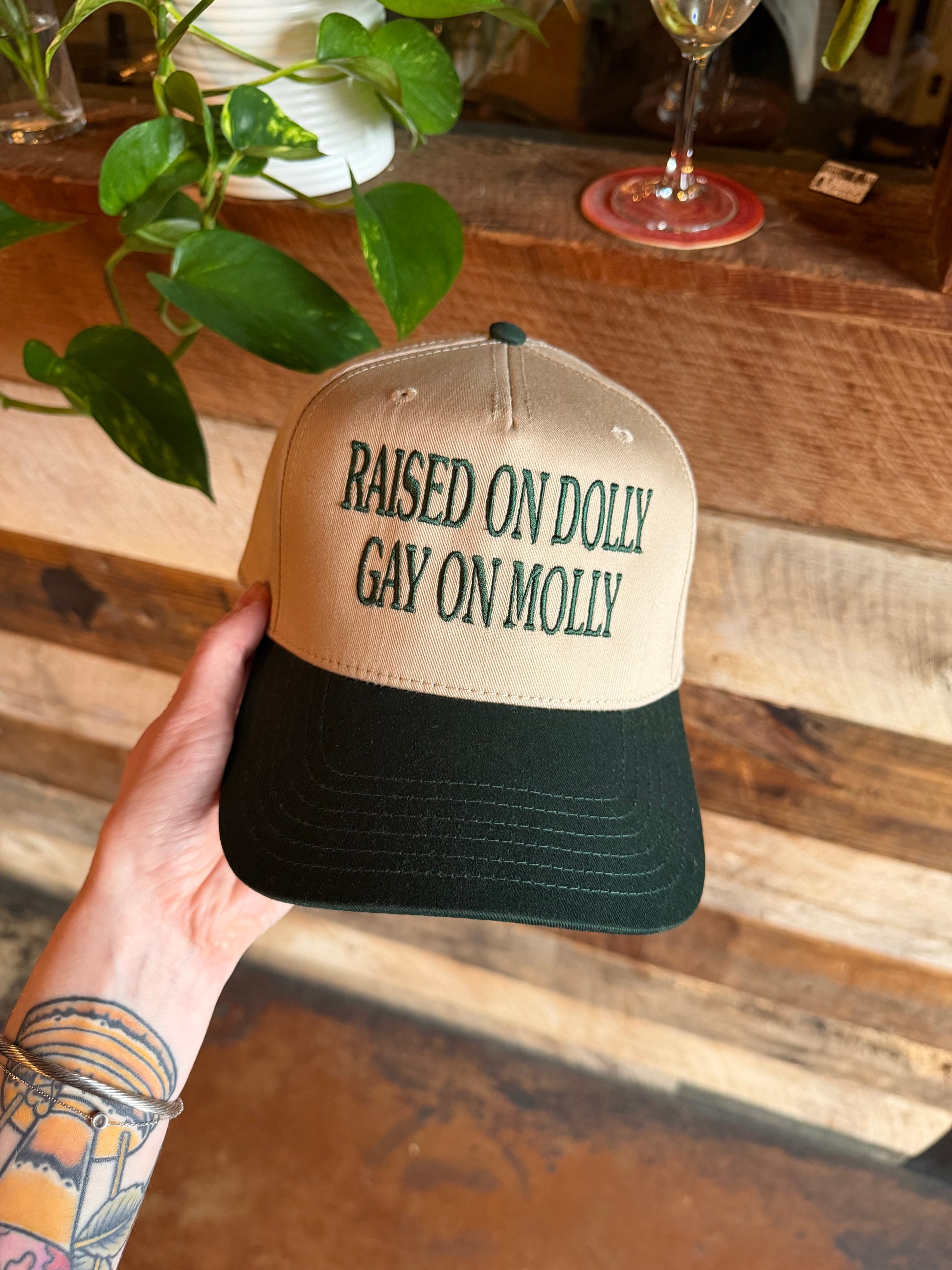 A little sweet, a little feral, and proud as hell. The “Raised on Dolly / Gay on Molly” hat is a love letter to small-town roots, loud feelings, and finding yourself somewhere between rhinestones and neon lights. Inspired by Dolly wisdom, late nights, and living honestly without asking permission, this hat doesn’t whisper—it sings. Stitched for the ones who grew up country, turned out colorful, and never plan on toning it down. Wear it like a confession, a punchline, or a badge of honor. However you read it, it reads you.
