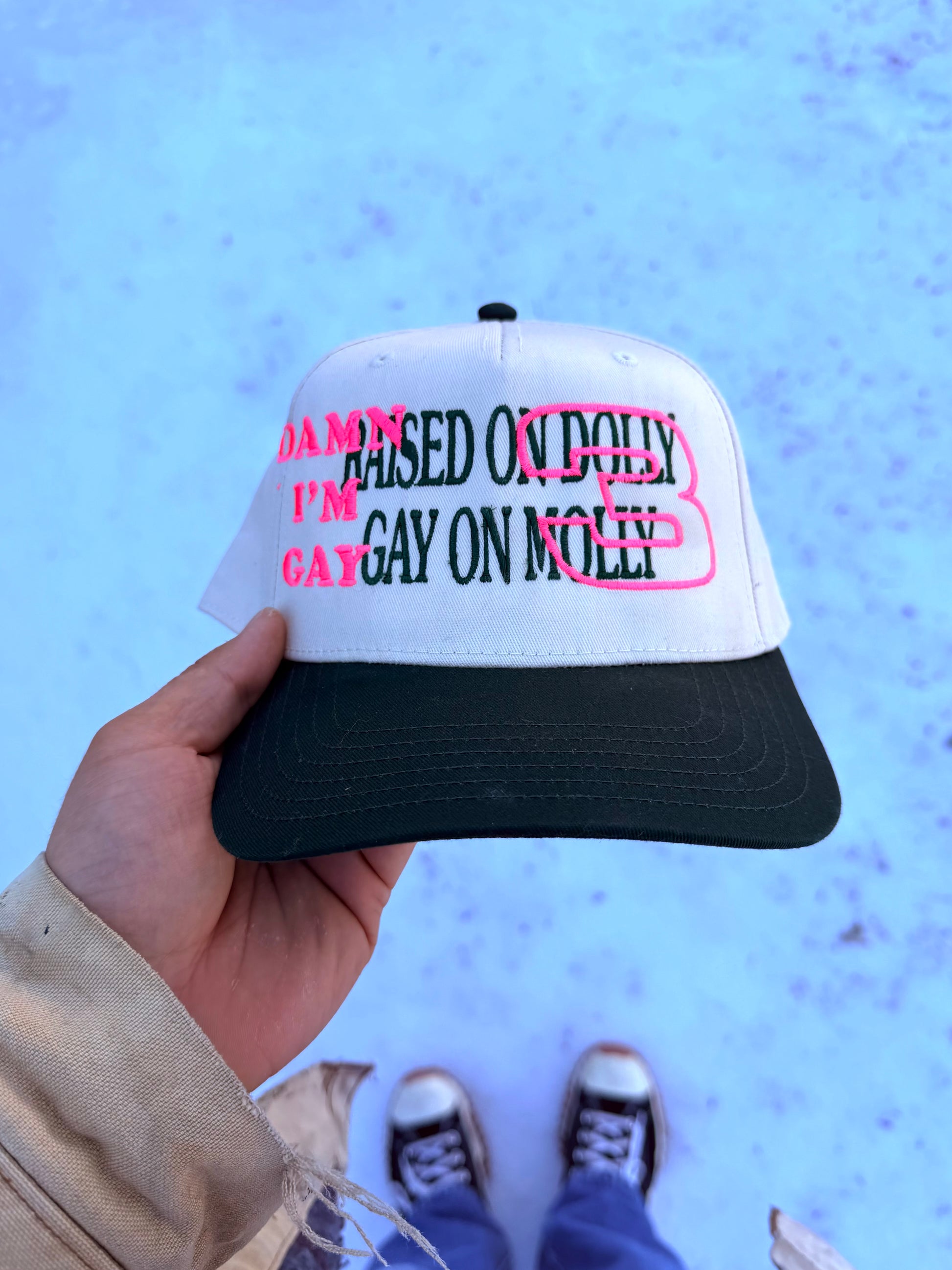 Each hat is designed individually, embroidered by Daddy’s own two hands, shaped, distressed, adjusted, overthought, and finally signed and numbered like a tiny piece of outlaw art. Sometimes the stitching leans just a touch. Sometimes the foam has a wrinkle. Sometimes the thread does its own thing. That’s not a flaw — that’s the magic.